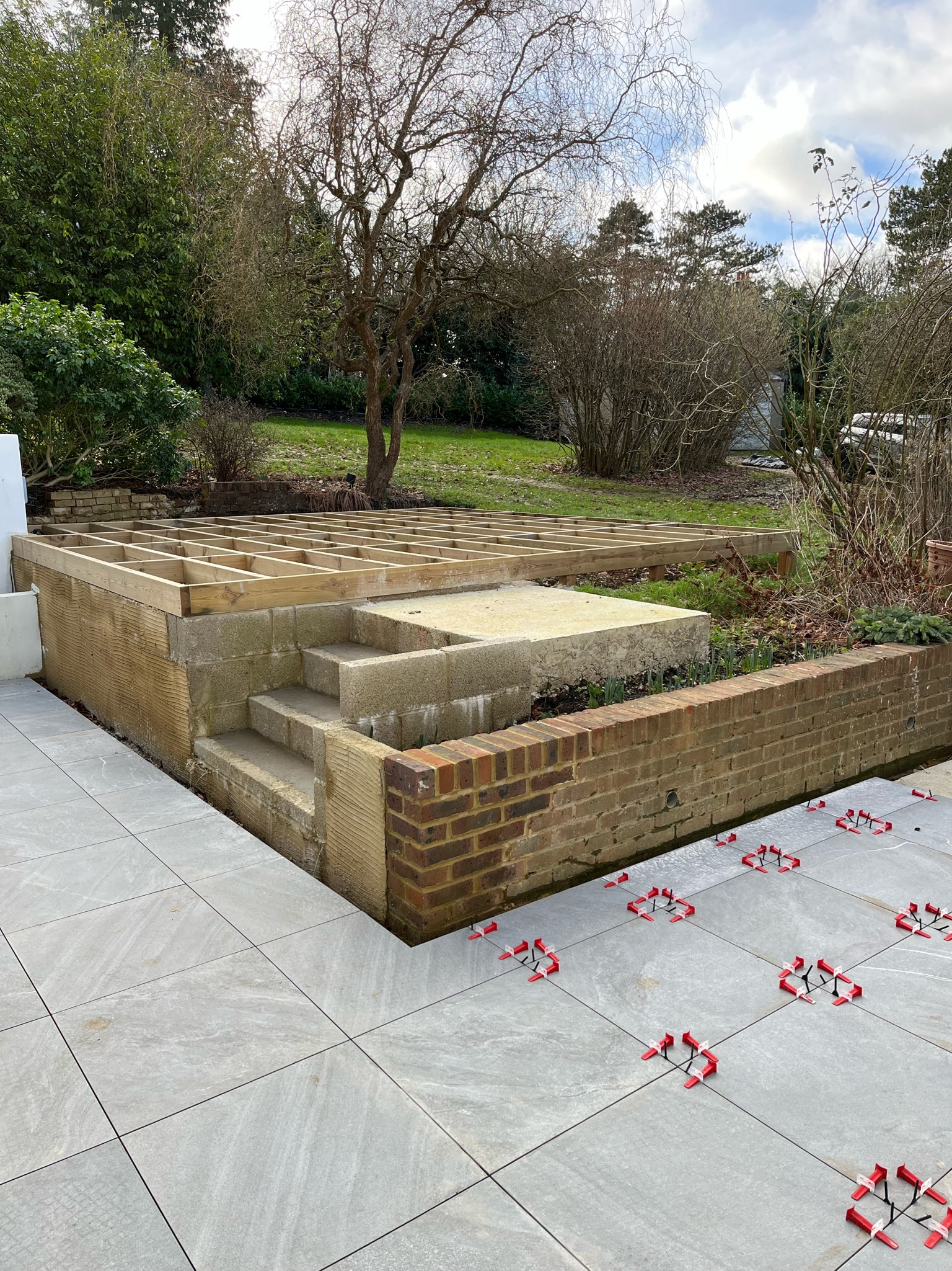 - Additional step added to stairs from patio to the garden, this will enable final levelling of grass once the landing area has been tiled for a finished height