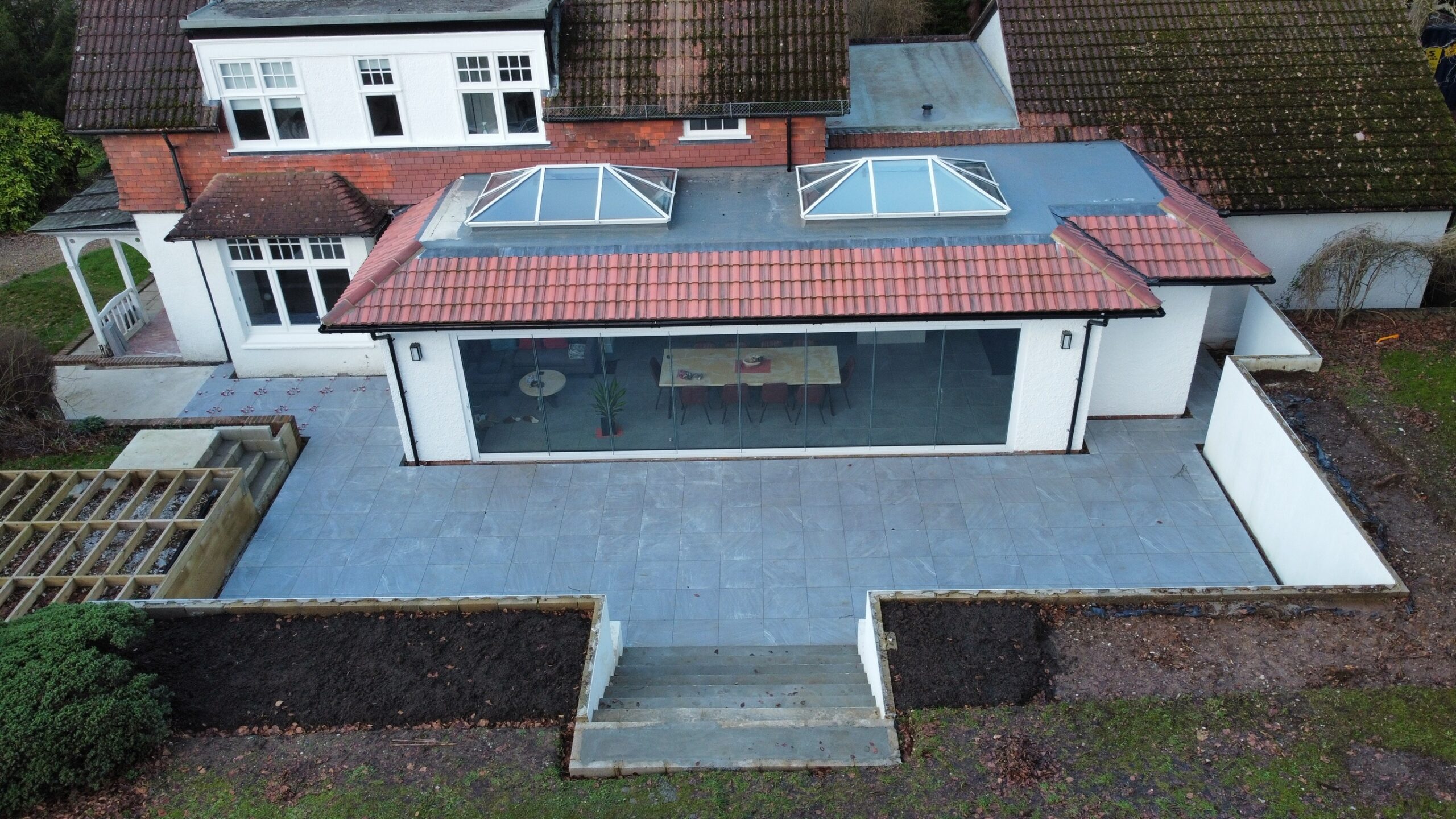 - Patio slabs laid to back door, completion of main patio area around to side by cat flap and lounge rear window – we still have all the grouting to be completed